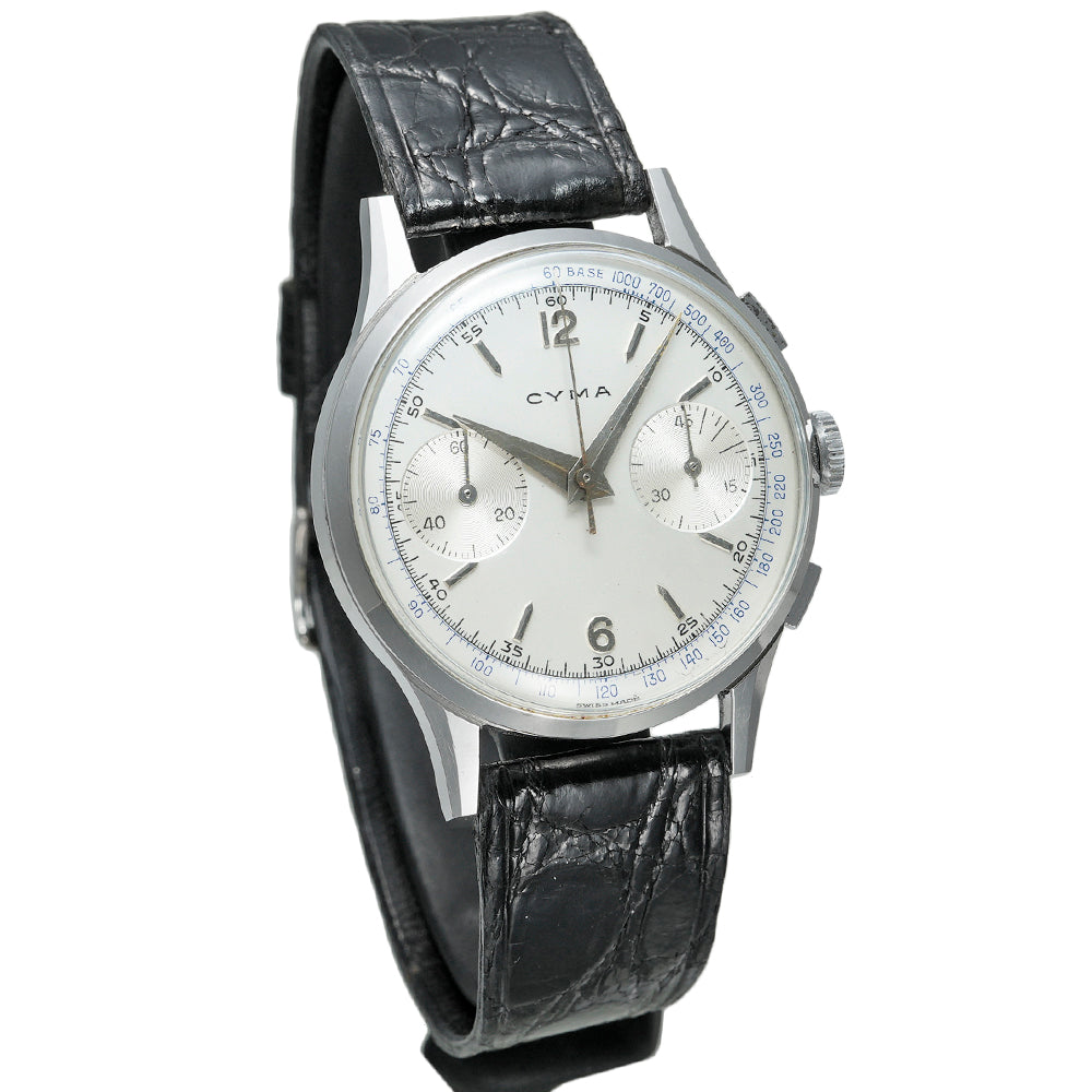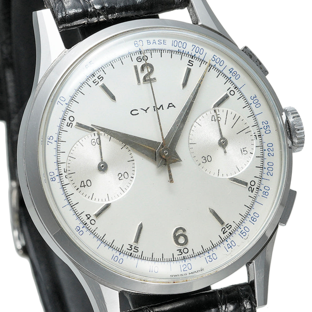 【ヴィンテージ/アンティーク品】 ダイヤルはオリジナルです。 裏蓋に正規輸入シールが残っております。 1940年代製のCYMAクロノグラフは、名機バルジュー22を搭載した手巻きのヴィンテージモデル。当時、多くの名門ブランドに採用され、精緻な操作性と信頼性で名を馳せた伝説のクロノグラフムーブメントを堪能できます。ほどよい艶をまとったクラシックなシルバーダイヤルが、落ち着きと気品を腕元に添えます。外周のブルーのタキメータースケールが爽やかなアクセントとなり、さりげない個性を演出。36mmケースと繊細なラグが手首に自然に馴染み、現代でも心地よく着用できます。ヴィンテージクロノグラフの機械美と風格を求める、大人の男性にふさわしい一本です。 日差:±60秒以内(※商品掲載時点でのタイムグラファーを用いた計測値です。) 純正パーツが入手困難な場合は、修理に必要なパーツを製作もしくは加工をして行う場合がございます。 詳細は在庫店舗までお問い合わせ下さい。 アンティーク/ヴィンテージ品の為、風防はプラスチックとなります。 革ベルトは社外製の中古品ですが、綺麗な状態です。