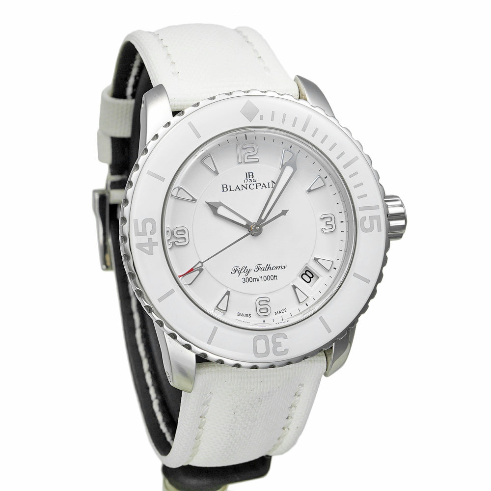 【USED品】 全体的に目立つような傷は無く、USED品としては綺麗な状態です。 ブランパンのダイバーズモデル、フィフティファゾムスのホワイトです。 黒やブルーの流通が多い為、白は珍しく貴重なお品となります。 ガラスに傷はございません。 革ベルトは純正で、中古品として若干の使用感がございます。
