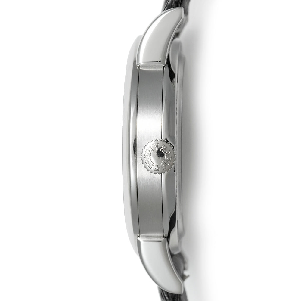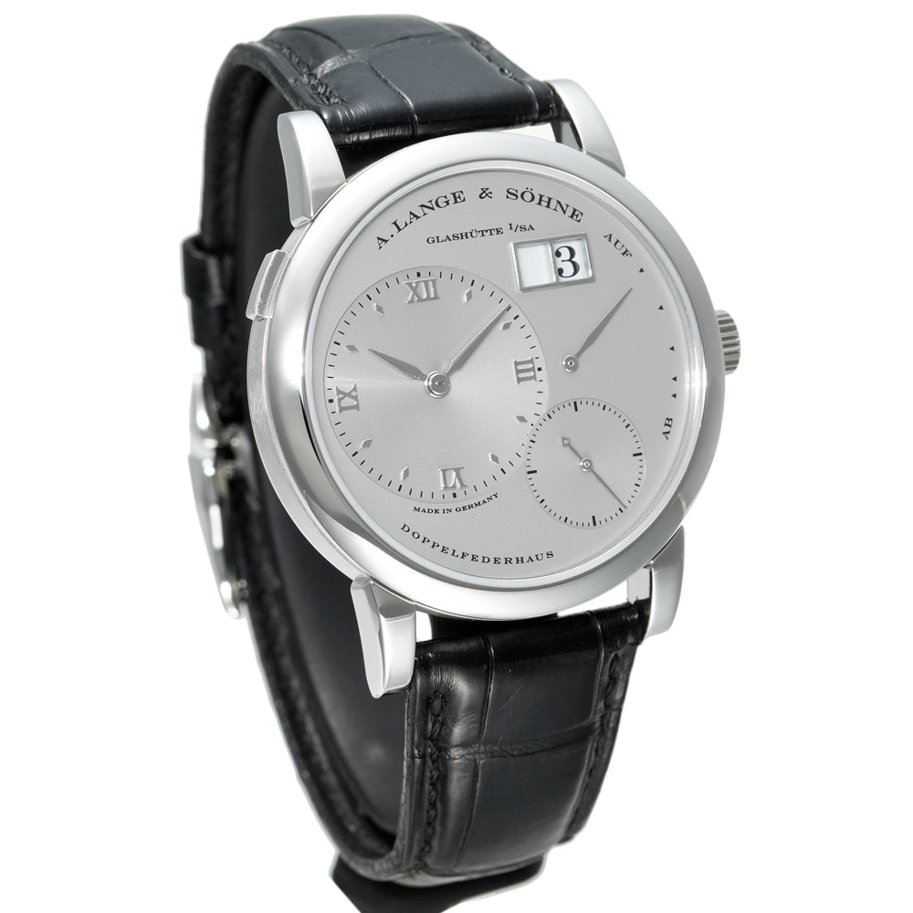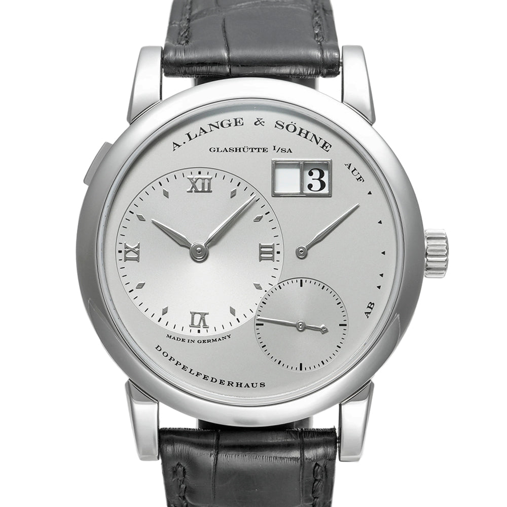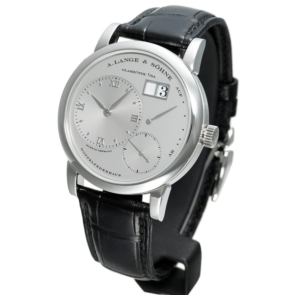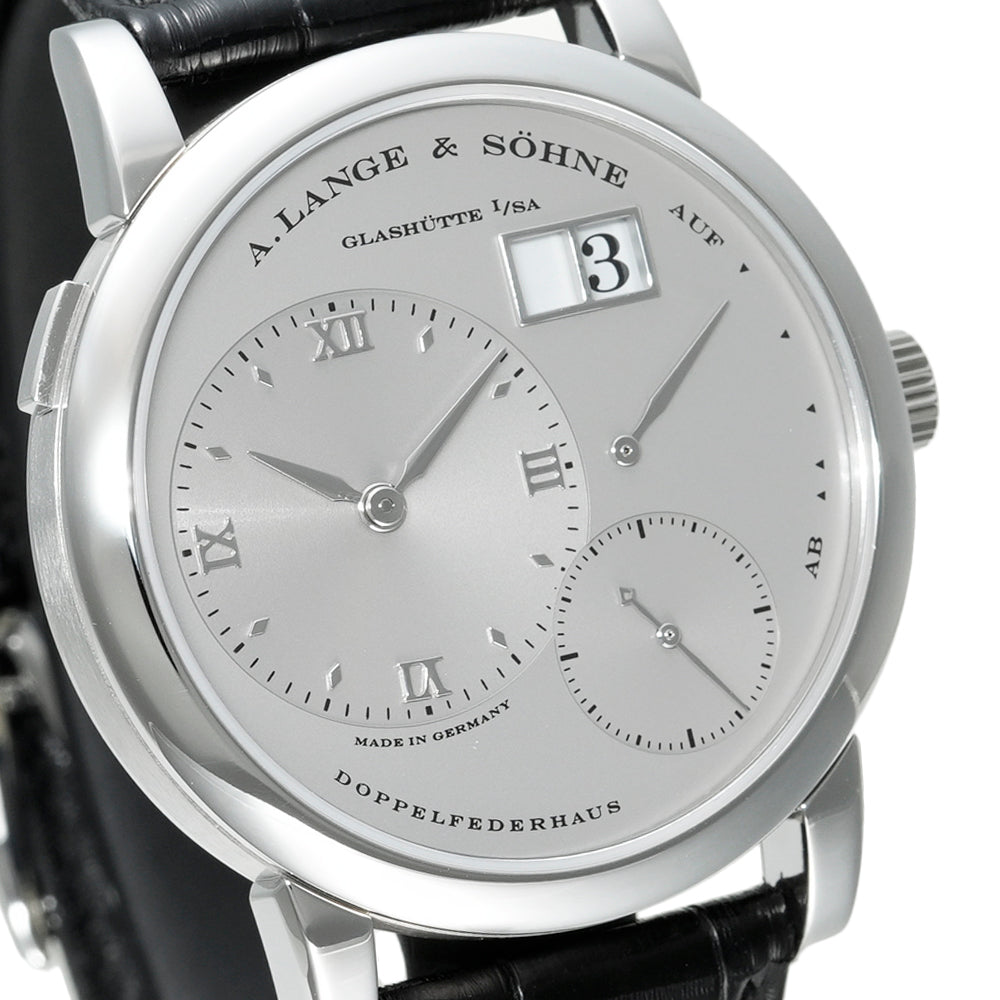 【USED品】 弊社提携修理工房にて外装仕上げを行っている為、 全体的に目立つような傷は無く、USED品としては綺麗な状態です。 Dバックル仕様のランゲ1です。 素材はプラチナ仕様の比較的生産本数の少ないモデルとなります。 プラチナモデルはダイヤルの色味が若干暗く、落ち着いた印象のデザインに変更されており、夜光塗料も使われていない為よりラグジュアリーな印象となります。 ガラスに傷はございません。 クロコベルトは純正で中古ですが、綺麗な状態です。