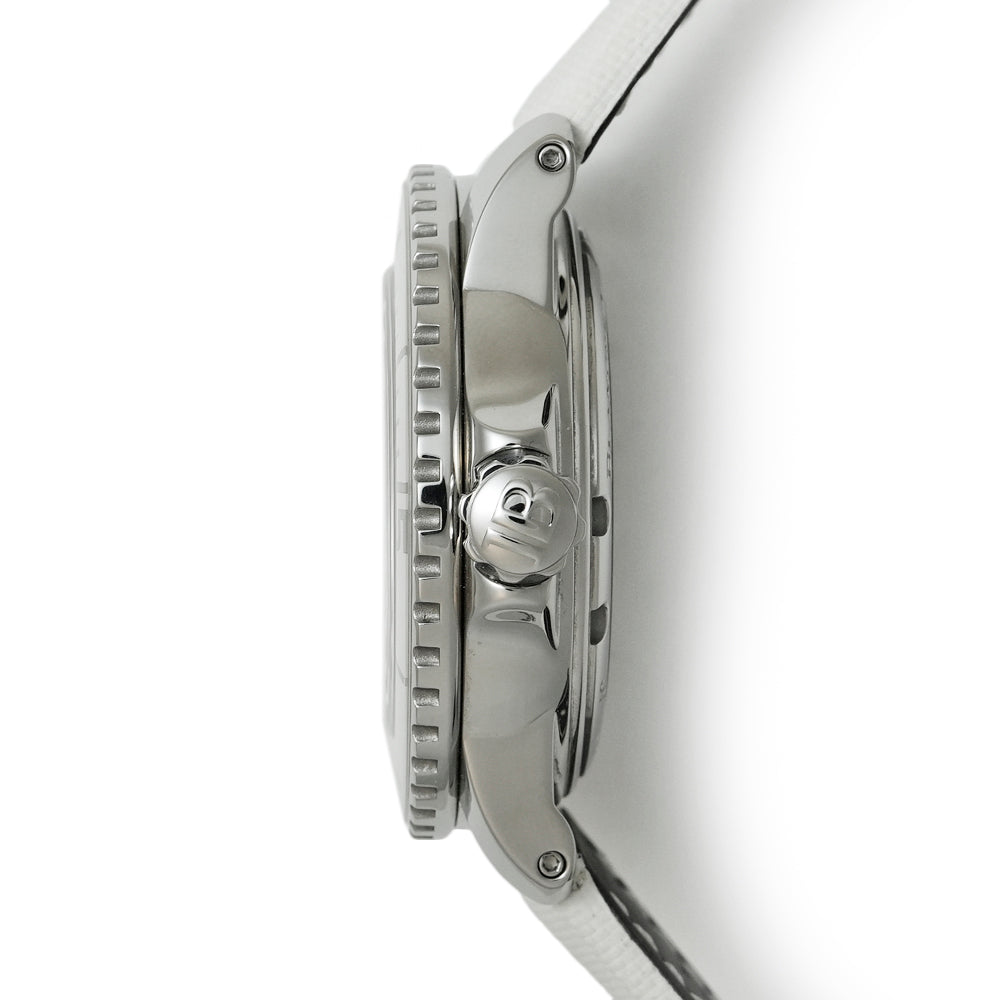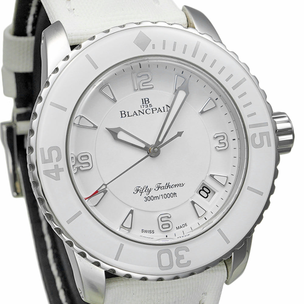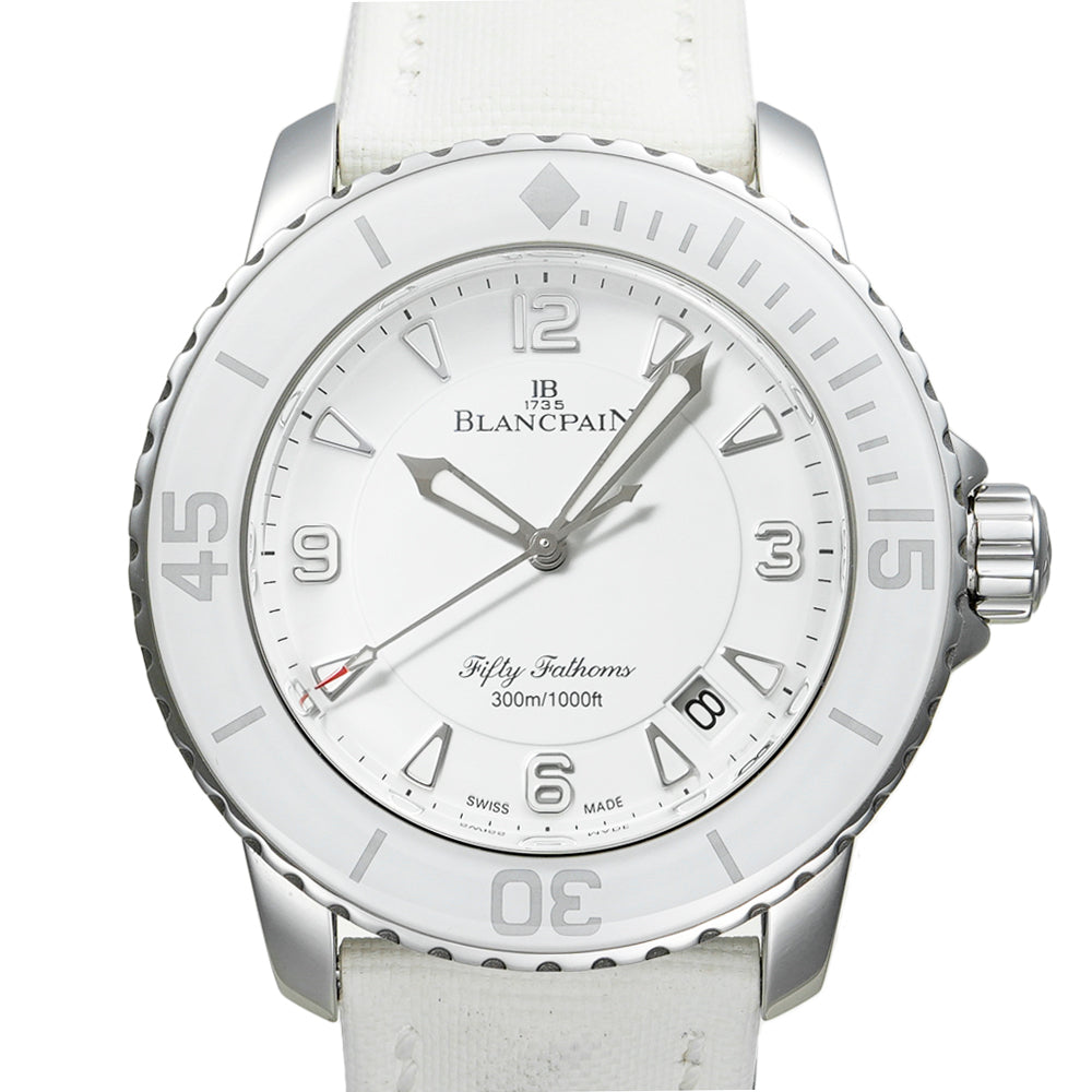 【USED品】 全体的に目立つような傷は無く、USED品としては綺麗な状態です。 ブランパンのダイバーズモデル、フィフティファゾムスのホワイトです。 黒やブルーの流通が多い為、白は珍しく貴重なお品となります。 ガラスに傷はございません。 革ベルトは純正で、中古品として若干の使用感がございます。