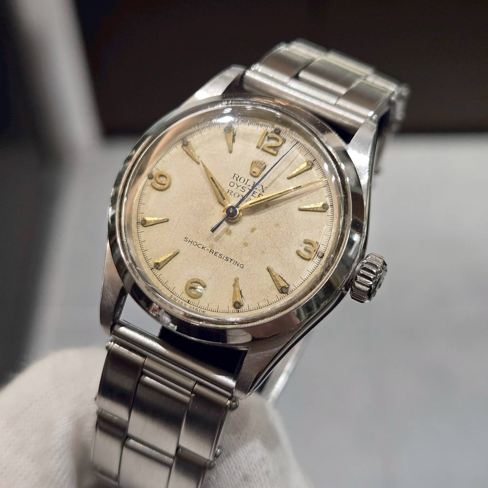 【ヴィンテージ/アンティーク品】 ダイヤルはリダンされておりますが、かなり前に修復されているようでアンティーク特有の雰囲気は損なわれておらず、全体的に良い味わいを感じられるお品となります。 日差:±60秒以内(※商品掲載時点でのタイムグラファーを用いた計測値です。) 純正パーツが入手困難な場合は、修理に必要なパーツを製作もしくは加工をして行う場合がございます。 詳細は在庫店舗までお問い合わせ下さい。 アンティーク/ヴィンテージ品の為、風防はプラスチックとなります。 ブレスレットは社外製の中古品が装着されております。 ブレスレットの内径は最大約19cmです。