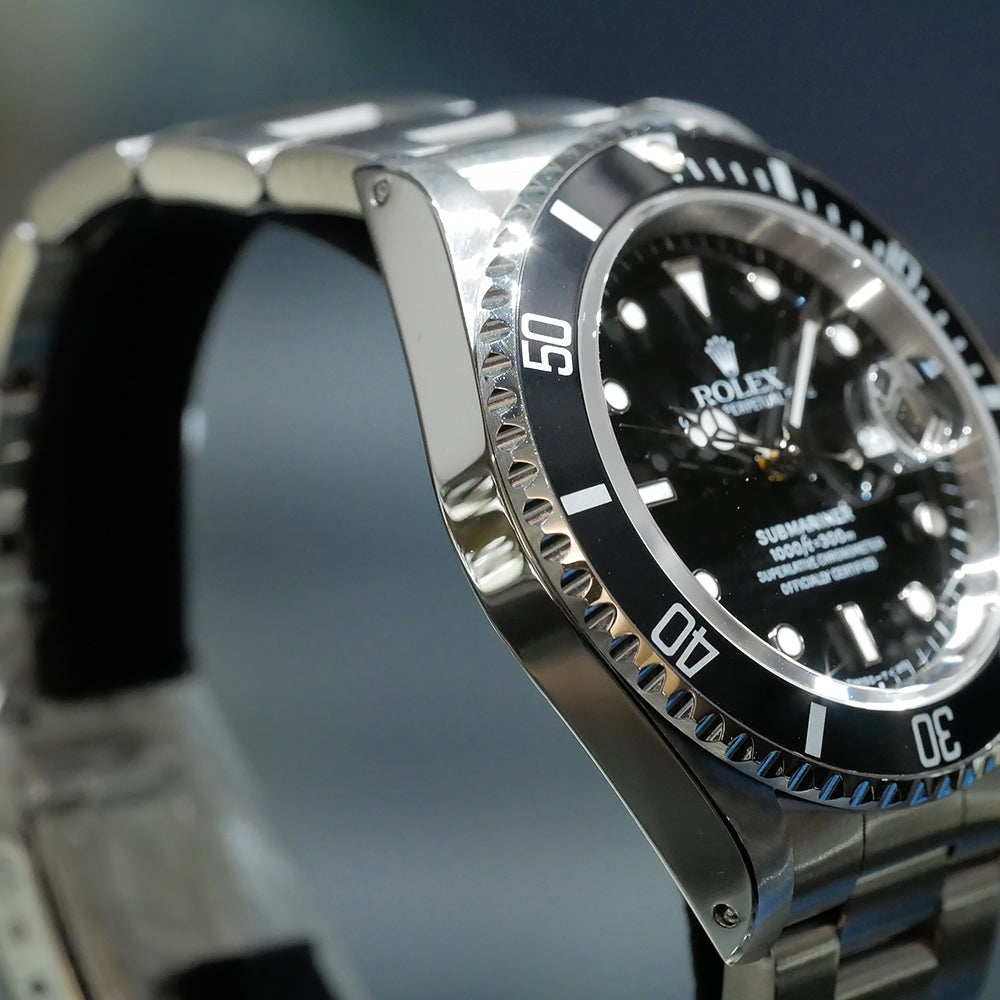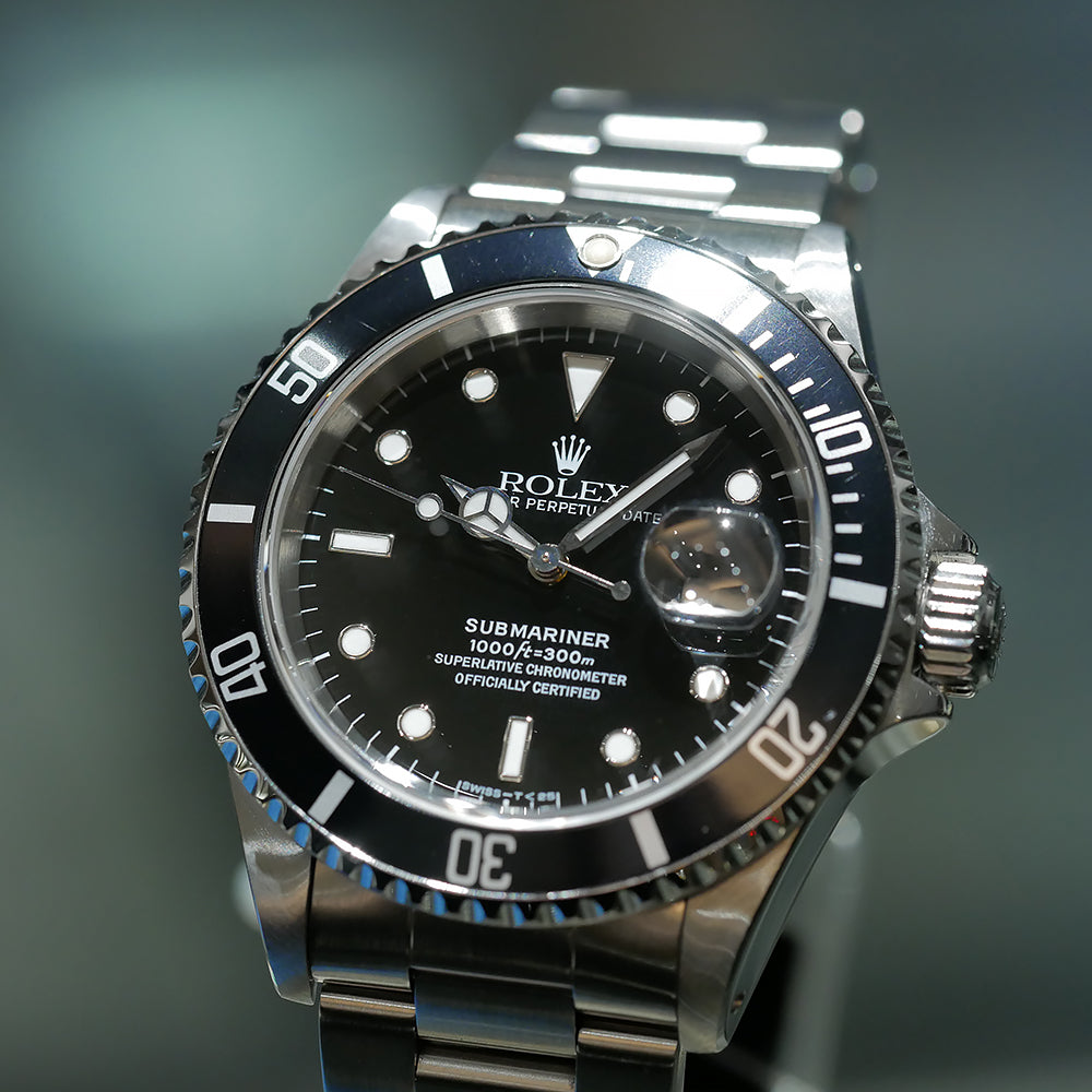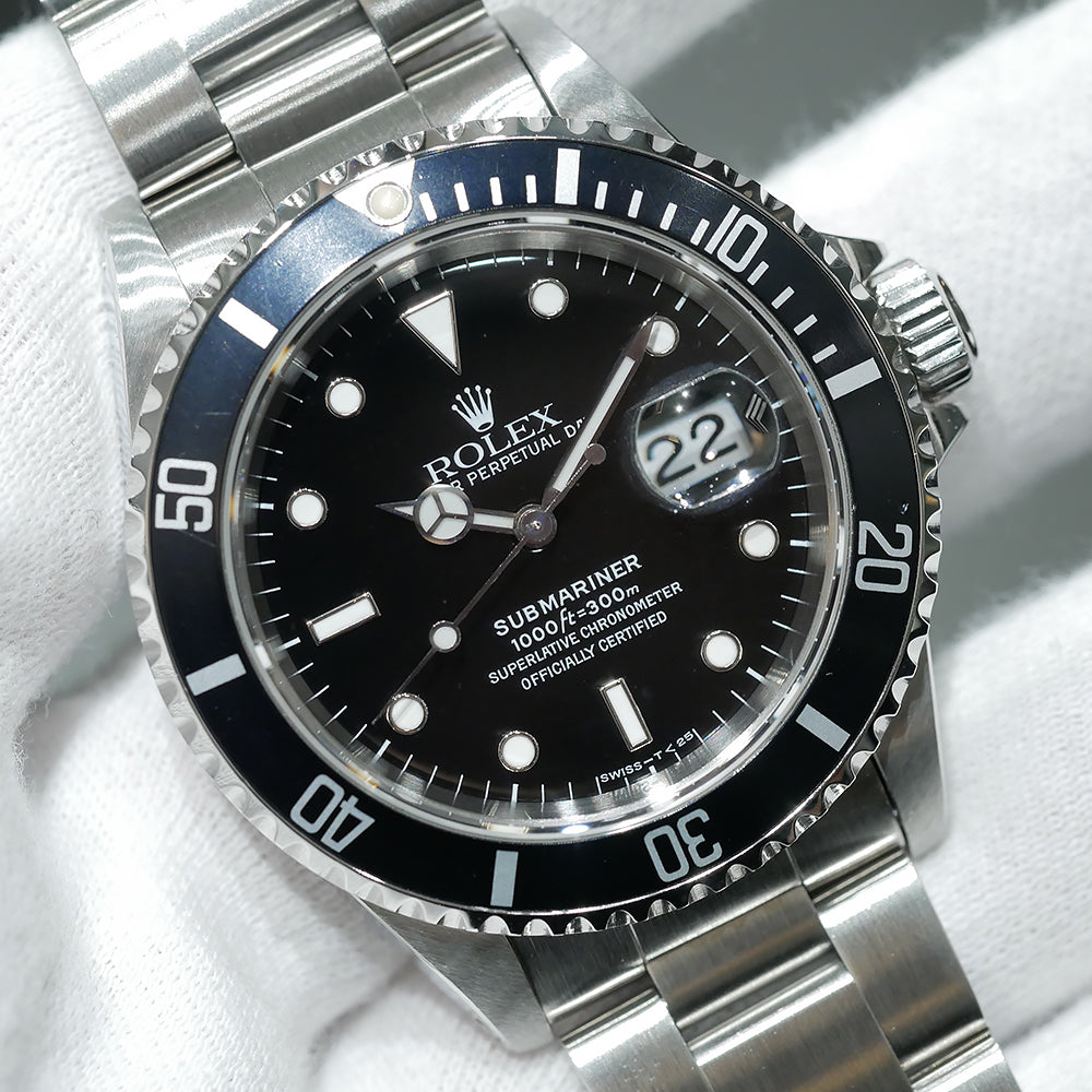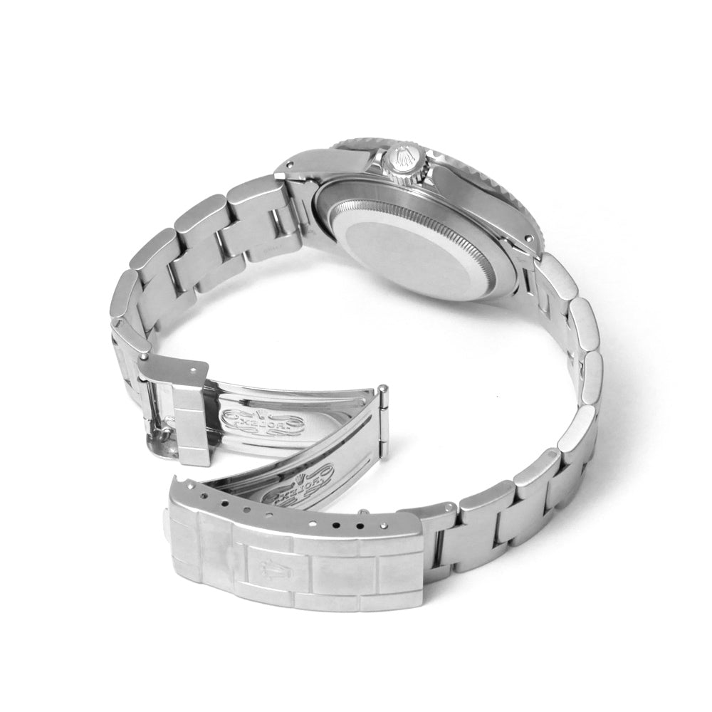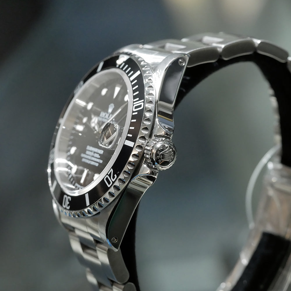 【USED品】 全体的に目立つような傷は無く、USED品としては綺麗な状態です。 夜光塗料には当時のオリジナルのトリチウム夜光が使われています。 まだトリチウム特有の焼けが浅く、比較的綺麗な状態を保っている品となります。 ベゼルは若干青みがかってきており良い雰囲気です。 また、年式を考慮すると傷も少なく良好な状態を保っています。 1996年の保証書が付属するコレクション性の高いお品となっております。 ガラスの5時位置に小傷がございますが、肉眼では目立たない為、ご使用頂くにあたり特に問題はございません。 ブレスレットの内径は最大約19cmです。