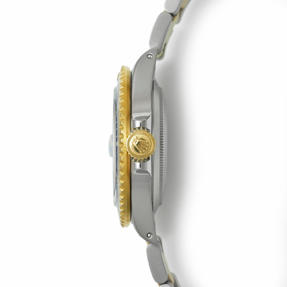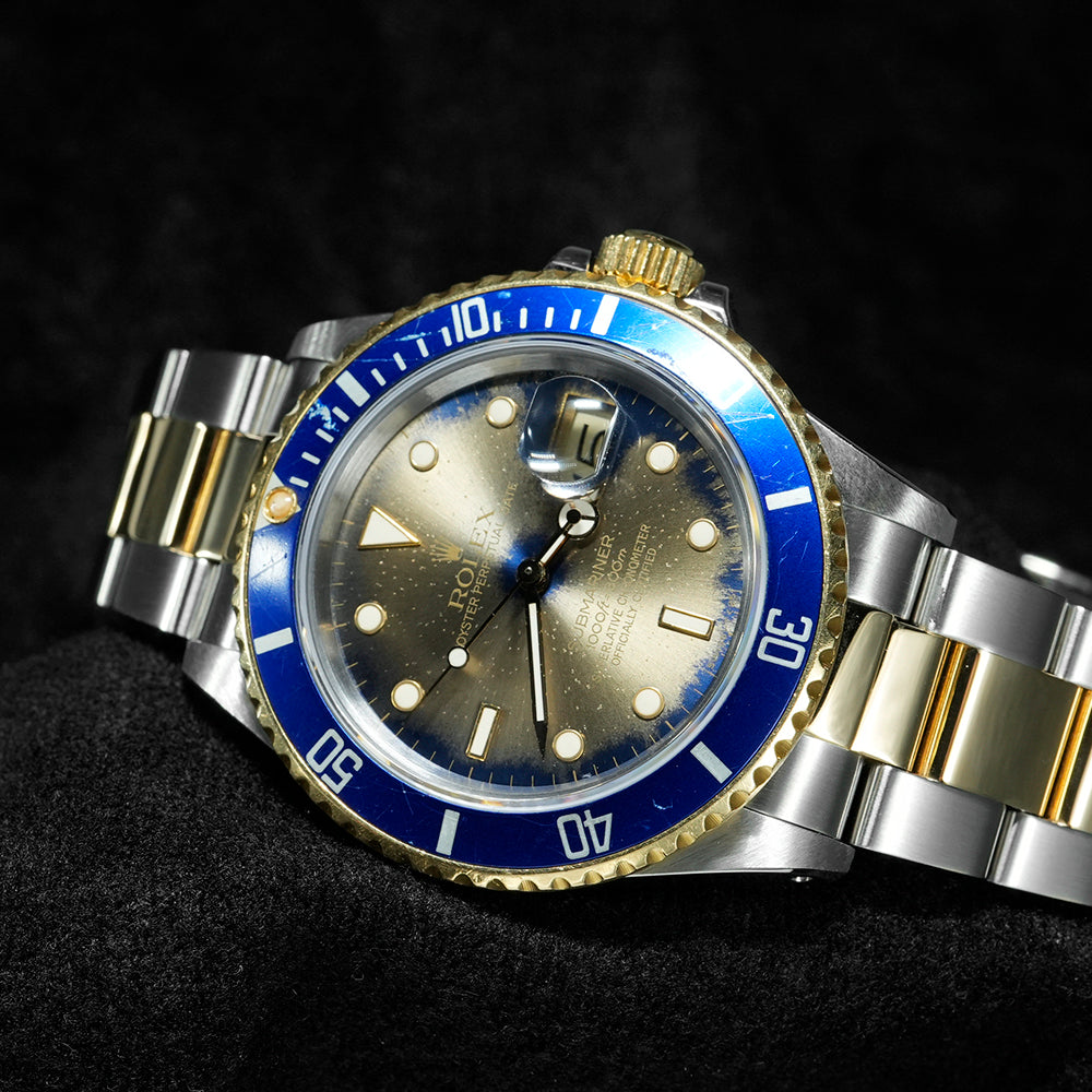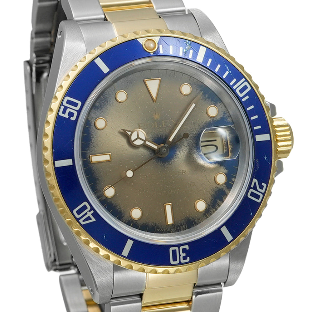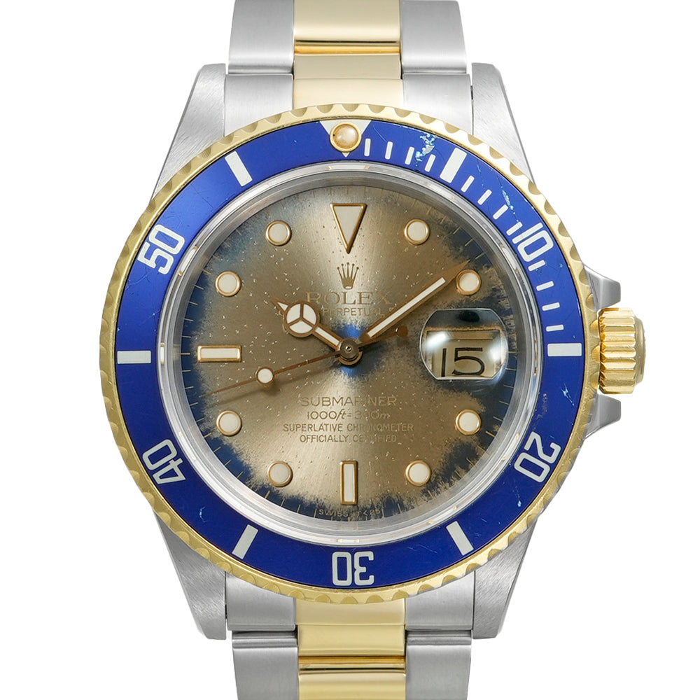 【USED品】 ダイヤルは経年によるブルーからシャンパンに変色されております。 ベゼルに傷がございます。 その他の部分は外装仕上げを行っており、目立つような傷はなくUSED品としては綺麗な状態です。 ガラスに傷はございません。 ブレスレットの内径は最大約16.5cmです。