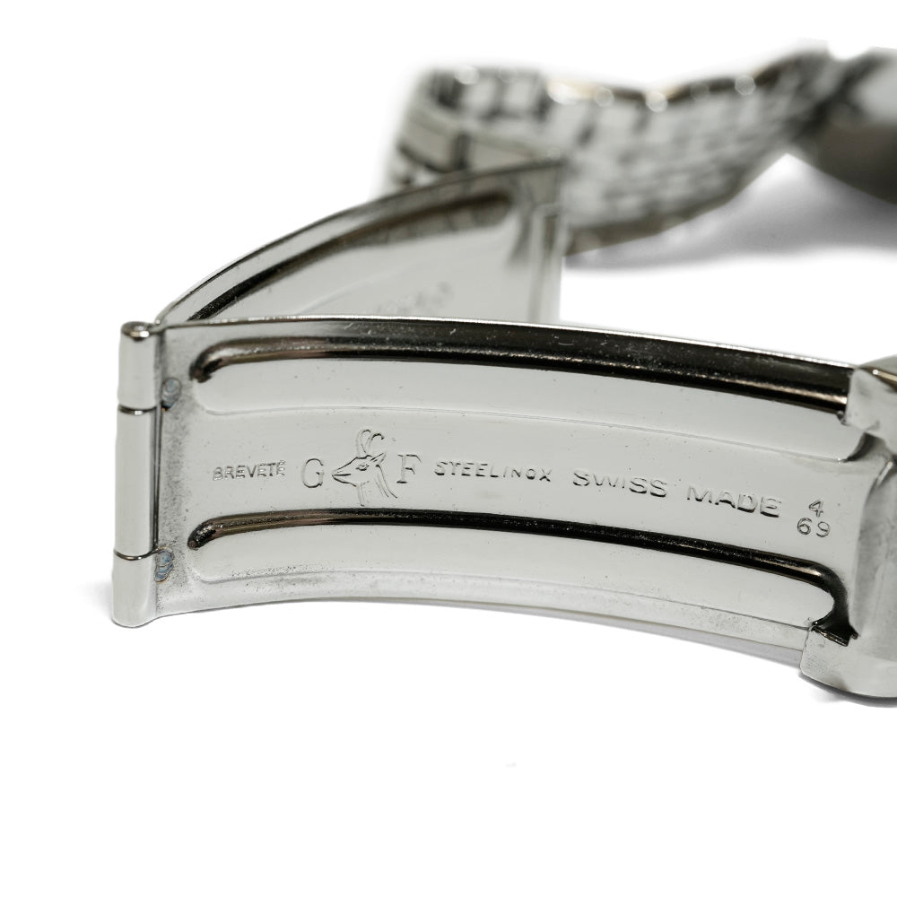 【ヴィンテージ/アンティーク品】 ダイヤルはオリジナルです。 非常に珍しい黒文字盤のインヂュニアです。 ブレスレットは人気のゲイフレアー社製が装着されています。 針は後期のパーツに交換されています。 日差:±60秒以内(※商品掲載時点でのタイムグラファーを用いた計測値です。) 純正パーツが入手困難な場合は、修理に必要なパーツを製作もしくは加工をして行う場合がございます。 詳細は在庫店舗までお問い合わせ下さい。 アンティーク/ヴィンテージ品の為、風防はプラスチックとなります。 ブレスレットの内径は最大約19cmです。