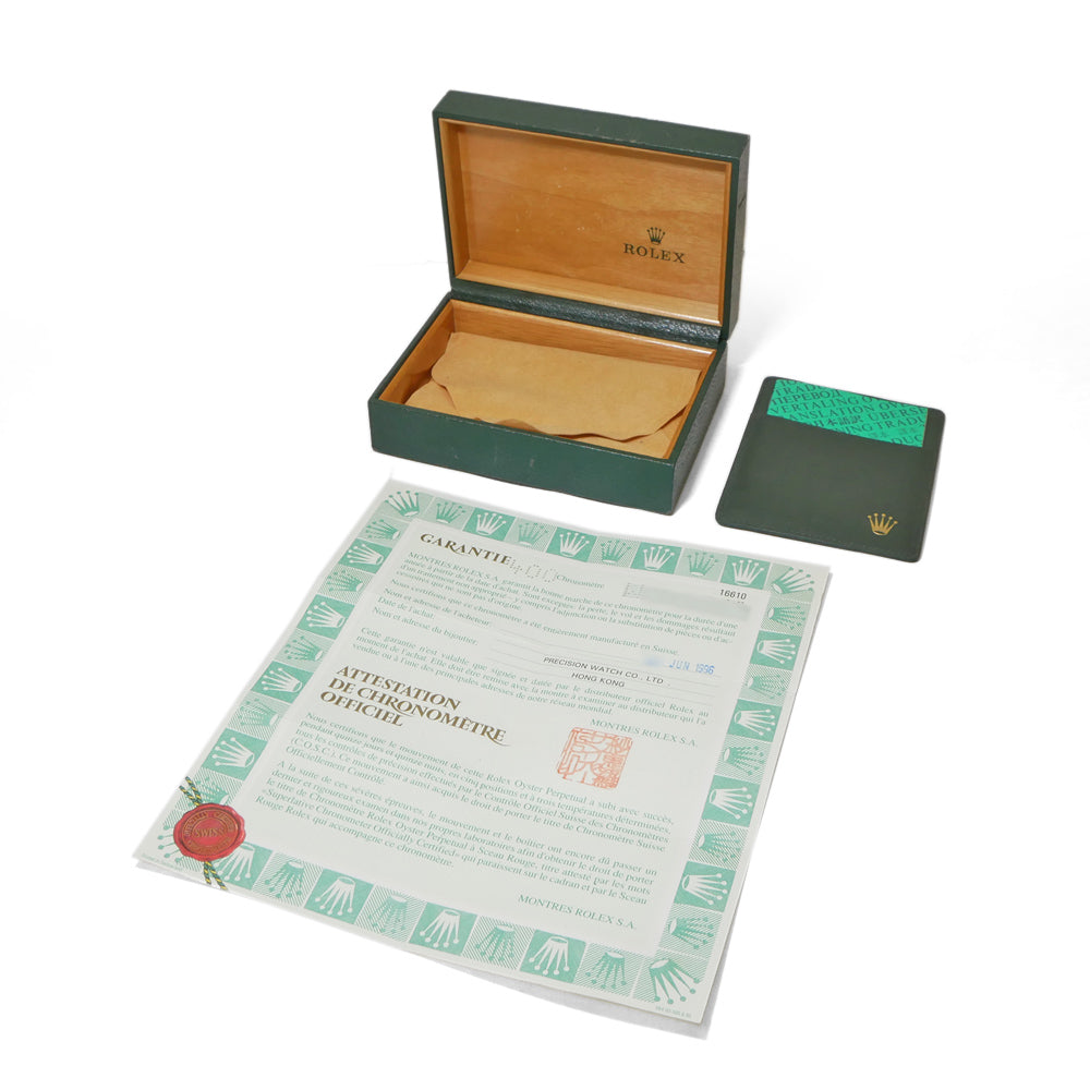 【USED品】 全体的に目立つような傷は無く、USED品としては綺麗な状態です。 夜光塗料には当時のオリジナルのトリチウム夜光が使われています。 まだトリチウム特有の焼けが浅く、比較的綺麗な状態を保っている品となります。 ベゼルは若干青みがかってきており良い雰囲気です。 また、年式を考慮すると傷も少なく良好な状態を保っています。 1996年の保証書が付属するコレクション性の高いお品となっております。 ガラスの5時位置に小傷がございますが、肉眼では目立たない為、ご使用頂くにあたり特に問題はございません。 ブレスレットの内径は最大約19cmです。