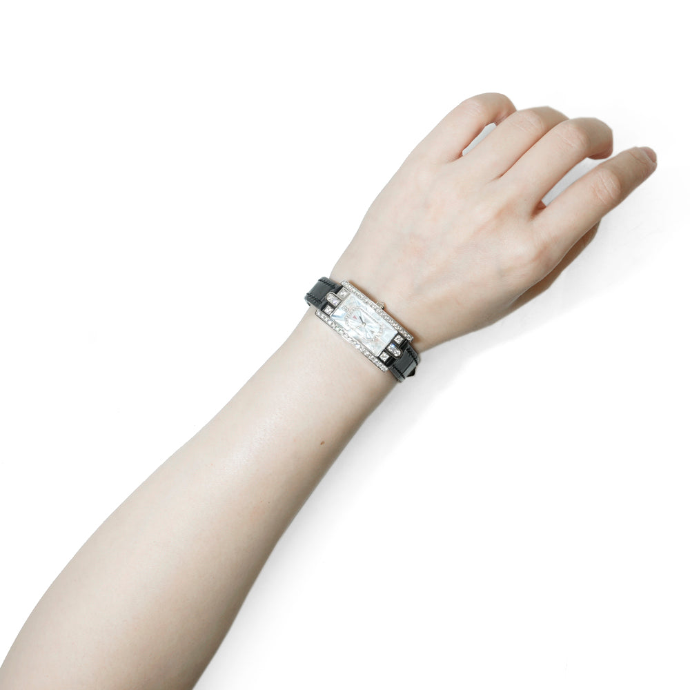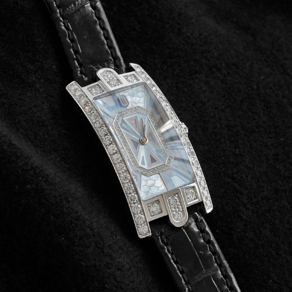 【国内正規USED品】 国内の正規店にて販売された個体です。 弊社提携修理工房にて外装仕上げを行っている為、 全体的に目立つような傷は無く、USED品としては綺麗な状態です。 文字盤はマルケトリ(象嵌細工)が施されており、非常にゴージャスな雰囲気となっております。 ガラスに傷はございません。 クロコベルトは純正で中古ですが、綺麗な状態です。